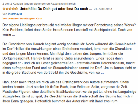 hier findet Ihr einige Auszüge aus Rezensionen bzw. Meinungen, die ich im Internet zu "Die Bruderschaft des Baums" gefunden habe.